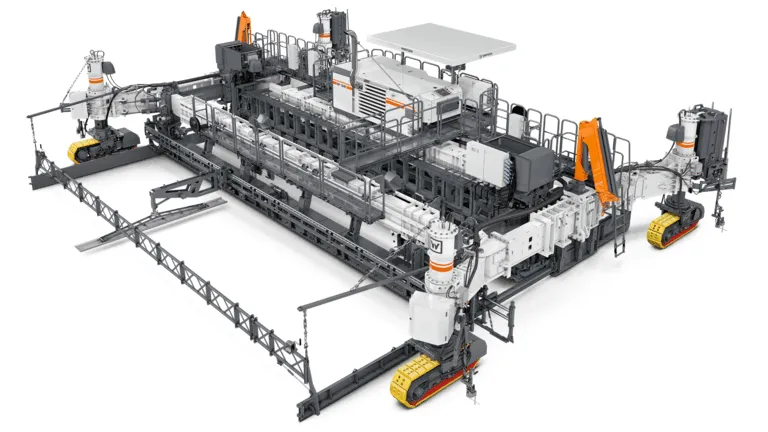 Бетоноукладчик с подвижной ("скользящей") формой для цементобетонных покрытий. Используется при крупных строительных проектах, где требуются бетонные покрытия большой площади.
